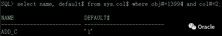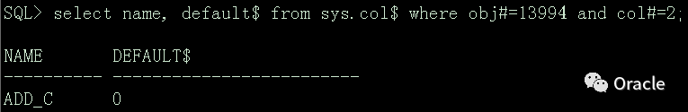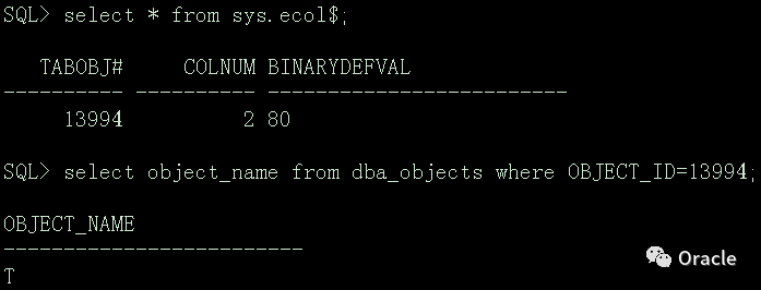 像上面第一次增加列的操作时,会同时更新sys.ecol$和sys.col$数据字典表,若以后再修改这个默认值,则只是会修改sys.col$的值,且以后每次查询也是从sys.col$的default$列获取默认值,我们可以根据sys.eclo$、sys.col$和dba_objects查询相关表和字段信息,