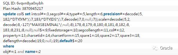 执行的是col$表的更新语句。从表名看,col$是列的数据字典表,使用了绑定变量,那这些值是什么,就成了问题的关键。