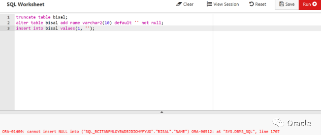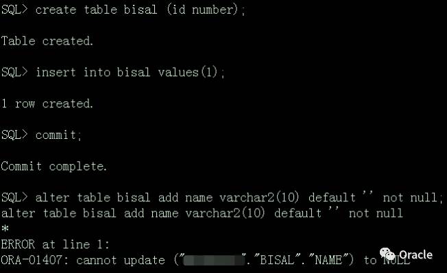 10.2.0.3库,从报错信息看ORA-01407,不能更新NAME列为空,可以看出此时是要将表中已存在记录的新列name做UPDATE设置为默认值的操作,由于有非空约束,因此不允许。