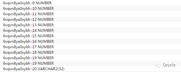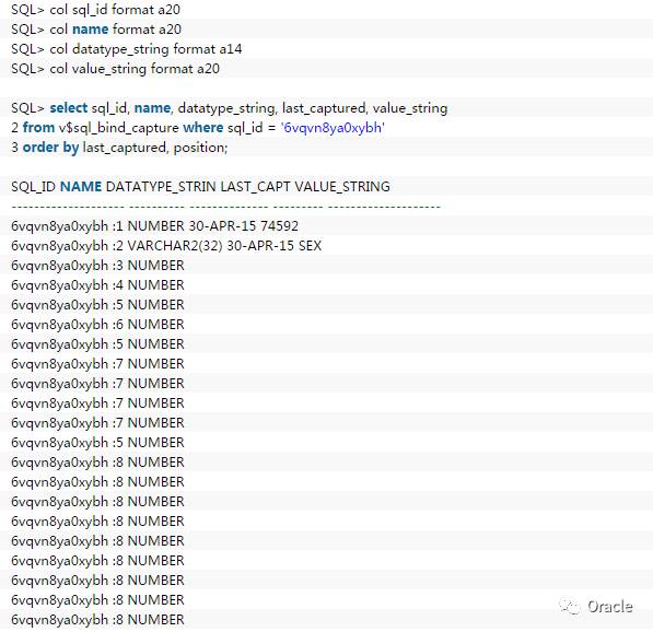 5. 使用v$sql_bind_capture可以查看仍在内存中的SQL绑定变量值,找了其中一些,有的已经查不到了,但上面10046前的最后一句SQL使用的绑定变量值如下: