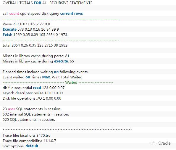 使用tkprof格式化trace文件,关键的信息如下: