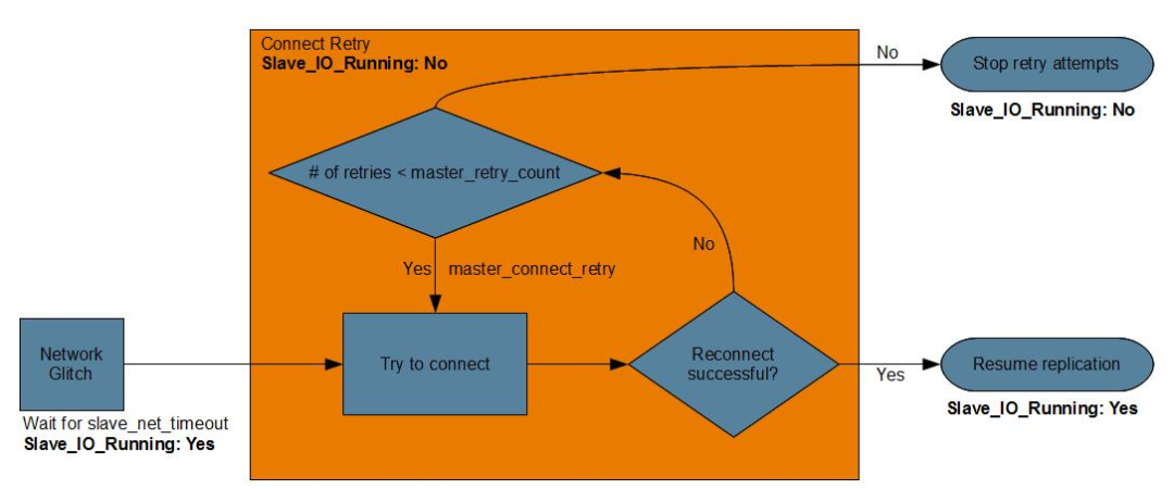 尝试重新建立连接失败后,再次尝试所间隔的时间(秒)。默认60秒。通过CHANGE MASTER