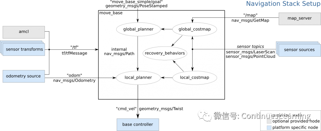 bool MoveBase::executeCycle(geometry_msgs::PoseStamped& goal, std::vector<geometry_msgs::PoseStamped>& global_plan){ boost::recursive_mutex::scoped_lock ecl(configuration_mutex_); //we need to be able to publish velocity commands geometry_msgs::Twist cmd_vel; //update feedback to correspond to our curent position geometry_msgs::PoseStamped global_pose; getRobotPose(global_pose, planner_costmap_ros_); const geometry_msgs::PoseStamped& current_position = global_pose; //push the feedback out move_base_msgs::MoveBaseFeedback feedback; feedback.base_position = current_position; as_->publishFeedback(feedback); //check to see if we've moved far enough to reset our oscillation timeout if(distance(current_position, oscillation_pose_) >= oscillation_distance_) { last_oscillation_reset_ = ros::Time::now(); oscillation_pose_ = current_position; //if our last recovery was caused by oscillation, we want to reset the recovery index if(recovery_trigger_ == OSCILLATION_R) recovery_index_ = 0; } //check that the observation buffers for the costmap are current, we don't want to drive blind if(!controller_costmap_ros_->isCurrent()){ ROS_WARN("[%s]:Sensor data is out of date, we're not going to allow commanding of the base for safety",ros::this_node::getName().c_str()); publishZeroVelocity(); return false; } //if we have a new plan then grab it and give it to the controller if(new_global_plan_){ //make sure to set the new plan flag to false new_global_plan_ = false; ROS_DEBUG_NAMED("move_base","Got a new plan...swap pointers"); //do a pointer swap under mutex std::vector<geometry_msgs::PoseStamped>* temp_plan = controller_plan_; boost::unique_lock<boost::recursive_mutex> lock(planner_mutex_); controller_plan_ = latest_plan_; latest_plan_ = temp_plan; lock.unlock(); ROS_DEBUG_NAMED("move_base","pointers swapped!"); if(!tc_->setPlan(*controller_plan_)){ //ABORT and SHUTDOWN COSTMAPS ROS_ERROR("Failed to pass global plan to the controller, aborting."); resetState(); //disable the planner thread lock.lock(); runPlanner_ = false; lock.unlock(); as_->setAborted(move_base_msgs::MoveBaseResult(), "Failed to pass global plan to the controller."); return true; } //make sure to reset recovery_index_ since we were able to find a valid plan if(recovery_trigger_ == PLANNING_R) recovery_index_ = 0; } //the move_base state machine, handles the control logic for navigation switch(state_){ //if we are in a planning state, then we'll attempt to make a plan case PLANNING: { boost::recursive_mutex::scoped_lock lock(planner_mutex_); runPlanner_ = true; planner_cond_.notify_one(); } ROS_DEBUG_NAMED("move_base","Waiting for plan, in the planning state."); break; //if we're controlling, we'll attempt to find valid velocity commands case CONTROLLING: ROS_DEBUG_NAMED("move_base","In controlling state."); //check to see if we've reached our goal if(tc_->isGoalReached()){ ROS_DEBUG_NAMED("move_base","Goal reached!"); resetState(); //disable the planner thread boost::unique_lock<boost::recursive_mutex> lock(planner_mutex_); runPlanner_ = false; lock.unlock(); as_->setSucceeded(move_base_msgs::MoveBaseResult(), "Goal reached."); return true; } //check for an oscillation condition if(oscillation_timeout_ > 0.0 && last_oscillation_reset_ + ros::Duration(oscillation_timeout_) < ros::Time::now()) { publishZeroVelocity(); state_ = CLEARING; recovery_trigger_ = OSCILLATION_R; } { boost::unique_lock<costmap_2d::Costmap2D::mutex_t> lock(*(controller_costmap_ros_->getCostmap()->getMutex())); //调用computeVelocityCommands进行局部规划 if(tc_->computeVelocityCommands(cmd_vel)){ ROS_DEBUG_NAMED( "move_base", "Got a valid command from the local planner: %.3lf, %.3lf, %.3lf", cmd_vel.linear.x, cmd_vel.linear.y, cmd_vel.angular.z ); last_valid_control_ = ros::Time::now(); //make sure that we send the velocity command to the base vel_pub_.publish(cmd_vel); if(recovery_trigger_ == CONTROLLING_R) recovery_index_ = 0; } else { ROS_DEBUG_NAMED("move_base", "The local planner could not find a valid plan."); ros::Time attempt_end = last_valid_control_ + ros::Duration(controller_patience_); //check if we've tried to find a valid control for longer than our time limit if(ros::Time::now() > attempt_end){ //we'll move into our obstacle clearing mode publishZeroVelocity(); state_ = CLEARING; recovery_trigger_ = CONTROLLING_R; } else{ //otherwise, if we can't find a valid control, we'll go back to planning last_valid_plan_ = ros::Time::now(); planning_retries_ = 0; state_ = PLANNING; publishZeroVelocity(); //enable the planner thread in case it isn't running on a clock boost::unique_lock<boost::recursive_mutex> lock(planner_mutex_); runPlanner_ = true; planner_cond_.notify_one(); lock.unlock(); } } } break; //we'll try to clear out space with any user-provided recovery behaviors case CLEARING: ROS_DEBUG_NAMED("move_base","In clearing/recovery state"); //we'll invoke whatever recovery behavior we're currently on if they're enabled if(recovery_behavior_enabled_ && recovery_index_ < recovery_behaviors_.size()){ ROS_DEBUG_NAMED("move_base_recovery","Executing behavior %u of %zu", recovery_index_, recovery_behaviors_.size()); recovery_behaviors_[recovery_index_]->runBehavior(); //we at least want to give the robot some time to stop oscillating after executing the behavior last_oscillation_reset_ = ros::Time::now(); //we'll check if the recovery behavior actually worked ROS_DEBUG_NAMED("move_base_recovery","Going back to planning state"); last_valid_plan_ = ros::Time::now(); planning_retries_ = 0; state_ = PLANNING; //update the index of the next recovery behavior that we'll try recovery_index_++; } else{ ROS_DEBUG_NAMED("move_base_recovery","All recovery behaviors have failed, locking the planner and disabling it."); //disable the planner thread boost::unique_lock<boost::recursive_mutex> lock(planner_mutex_); runPlanner_ = false; lock.unlock(); ROS_DEBUG_NAMED("move_base_recovery","Something should abort after this."); if(recovery_trigger_ == CONTROLLING_R){ ROS_E