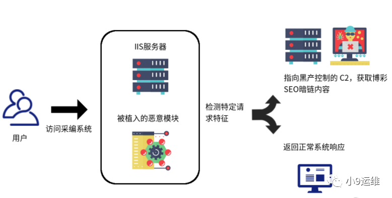 这种劫持方式比较隐蔽,通过在服务器的IIS上加载恶意模块,当收到特定的HTTP请求时会加载该恶意模块指向的暗链,且易绕过普通的杀毒软件的检测。