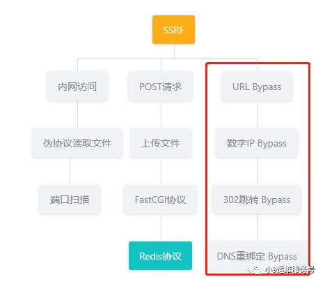SSRF漏洞思维导图如下,本篇主要介绍利用SSRF Bypass利用原理与方式