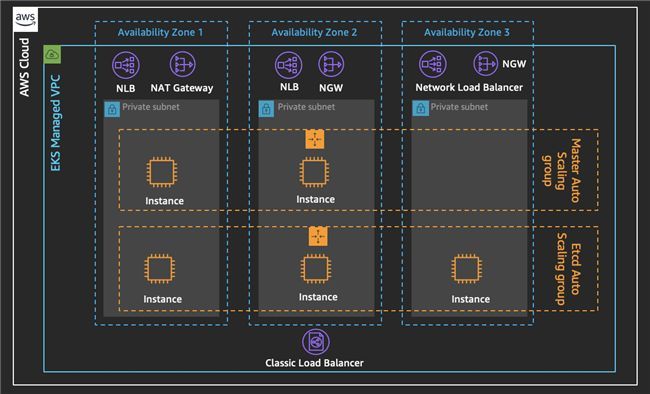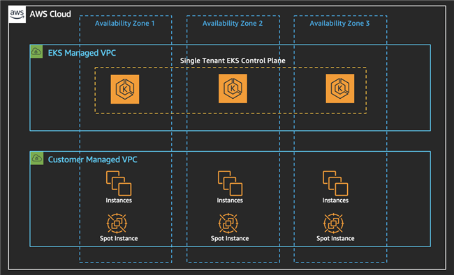 Amazon EKS 的控制平面由AWS托管,跨越多个可用区,可扩展且高度可用。其中etcd持久层的Auto Scaling Group Minimum Size是3,跨三个可用区,能够在某个可用区不可用的情况下(虽然概率极低)保证etcd 可读可写,无状态的 Kubernetes API Auto Scaling Group Minimum Size是2,跨越两个可用区, 用户可以根据Amazon EKS集群的压力为控制面板扩容。Amazon EKS会自动检测和替换运行状况不佳的主节点,以确保Kubernetes控制平面的高可用性。控制平面的架构如下图所示: