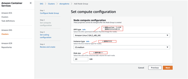 点击 Next, 配置Node的AMI,实例类型以及磁盘的大小: