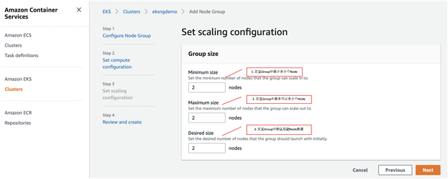 可以看到,利用Managed Node Group的特性,在控制台上只需要简单的几步操作,就可以完成EKS集群的扩容。