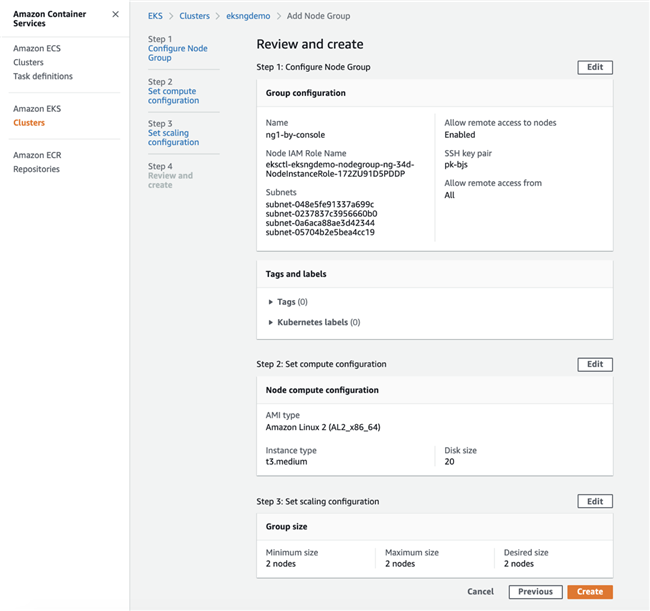 点击Next,进入Review界面,在确认无误后,点击Create按钮,就可完成Managed Node Group的创建。