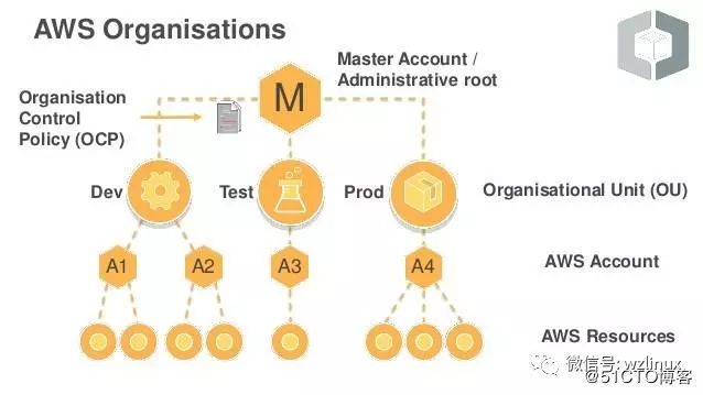 每一个OU下面可以分配若干个不同的AWS账号,每一个账号拥有不同的访问AWS的权限。