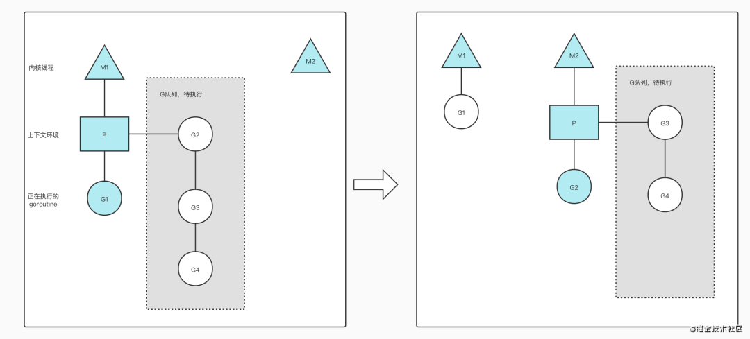 当G1结束后,M1会重新拿回P来完成,如果拿不到就丢到全局runqueue中,然后自己放到线程池或转入休眠状态。空闲的上下文P会周期性的检查全局runqueue上的goroutine,并且执行它。