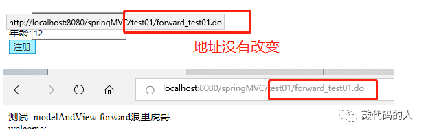 <form action="test01/forward_test01.do" method="post">姓名:<input type="text" name = "name"/><br>年龄:<input type="text" name = "age"/><br><input type="submit" value="注册"/></form>