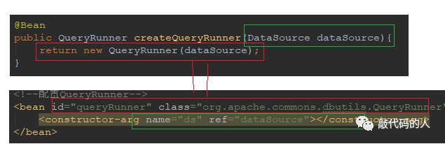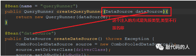 @Bean(name = "queryRunner")public QueryRunner createQueryRunner(@Qualifier(value = "ds") DataSource dataSource){return new QueryRunner(dataSource);}@Bean("ds")public DataSource createDateSource() throws Exception {ComboPooledDataSource source = new ComboPooledDataSource();source.setDriverClass(driverClass);source.setJdbcUrl(jdbcUrl);source.setUser(user);source.setPassword(passeWord);return source;}