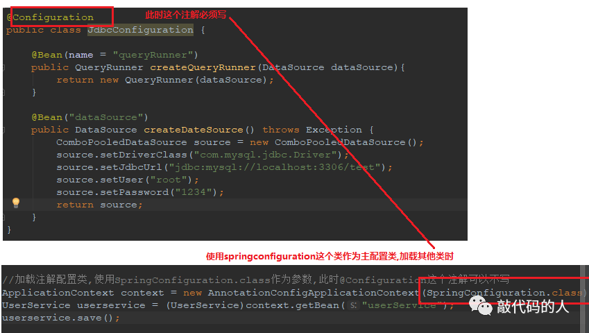 @Configuration//表明是一个配置类@ComponentScan("com.huge")//相当于开启了注解扫描器public class SpringConfiguration {@Bean//注:如果这个dataSource这个对象在容器中没有就会报错//这样方法的返回一个QueryRunner 对象会存入spring的容器中public QueryRunner createQueryRunner(DataSource dataSource){return new QueryRunner(dataSource);}@Beanpublic DataSource createDateSource() throws Exception {ComboPooledDataSource source = new ComboPooledDataSource();source.setDriverClass("com.mysql.jdbc.Driver");source.setJdbcUrl("jdbcUrl");source.setUser("root");source.setPassword("1234");return source;}}
