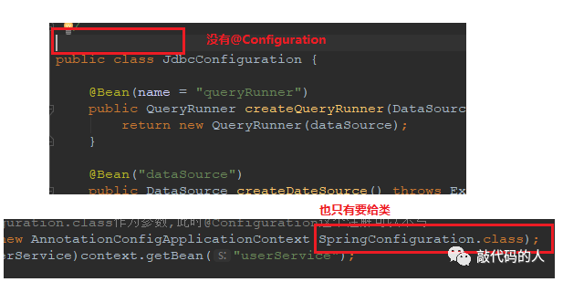 细节:当配置类作为AnnotationConfigApplicationContext对象创建的参数时,该注解可以不写。
