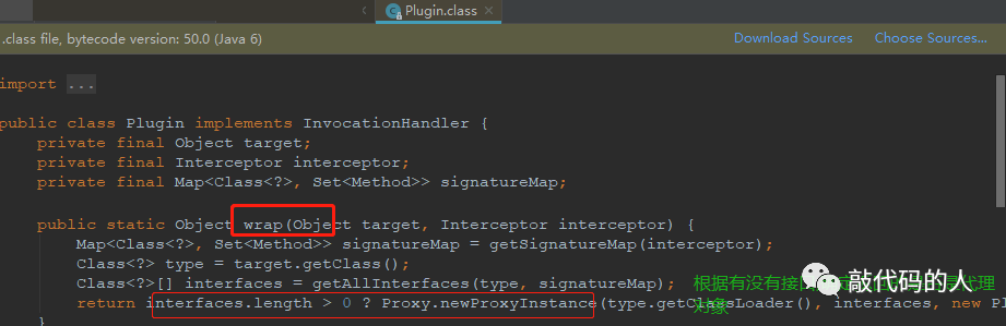 对于plugin方法而言,其实Mybatis已经为我们提供了一个实现。Mybatis中有一个叫做Plugin的类,里面有一个静态方法wrap(Object target,Interceptor interceptor),通过该方法可以决定要返回的对象是目标对象还是对应的代理。