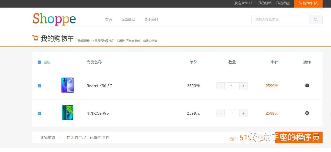 购物车采用vuex实现,页面效果参考了小米商城的购物车。