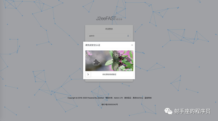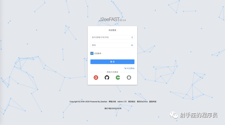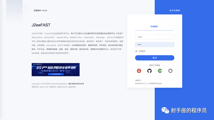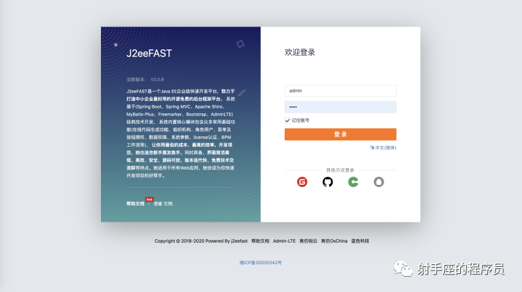 初次使用系统需要证书,项目启动会打出机器码,校验码等信息,请登录 http://demo.j2eefast.com 演示网站 账号 admin 密码 admin