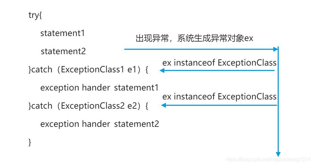 当程序进入负责异常处理的catch块时,系统生成的异常对象ex将会传给catch后的异常参数。try后面可以跟catch块,当系统发生不同的异常情况时,系统会生成不同的ex对象。在通常情况下如果try块被执行一次,则try后只有一个catch块被执行,除非使用continue,否则不会执行多个catch块。