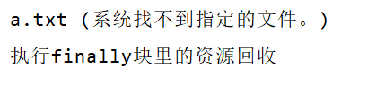 public static void main(String[] args) {FileInputStream fis=null;try {fis = new FileInputStream("a.txt");}catch (IOException ioe){System.out.println(ioe.getMessage());//a.txt (系统找不到指定的文件。)return; //强制方法返回//System.exit(1);//退出虚拟机}finally {if(fis!=null){try {fis.close();}catch (IOException ioe){ioe.printStackTrace();}}System.out.println("执行finally块里的资源回收");//执行finally块里的资源回收}}