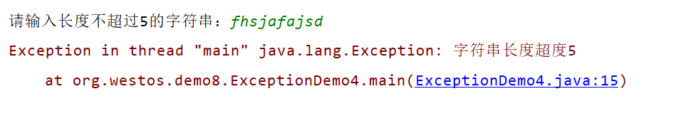 public static void main(String[] args) throws Exception {//输入字符串长度不超过5,否则引发异常Scanner sc = new Scanner(System.in);System.out.print("请输入长度不超过5的字符串:");String s=sc.next();if(s.length()<5){System.out.println(s);}else {throw new Exception("字符串长度超度5");}}