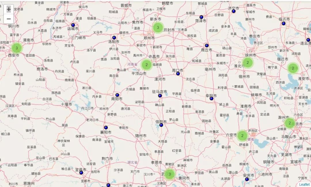 for e in myresult: folium.RegularPolygonMarker( [e[0],e[1]], popup=str(e[2])+":"+str(e[3]), fill_color='#769d96', number_of_sides=10, radius=10 ).add_to(oneUserMap) others = full.loc[full['cities']!='郑州市',["lat","lon"]].values.tolist()