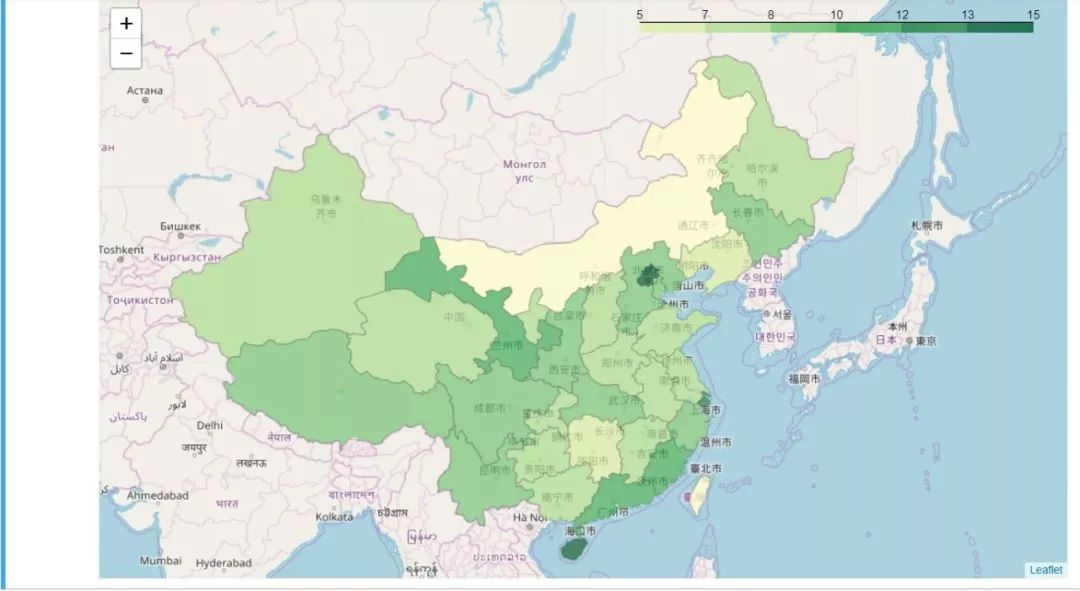 China_map = folium.Map(location=[35,120], zoom_start=4) China_map.choropleth( geo_data=open('D:/R/mapdata/State/china.geojson',encoding = 'utf-8').read(), data=mydata, columns=['province', 'zhibiao'], key_on= 'feature.properties.name', fill_color='YlGn', fill_opacity=0.7, line_opacity=0.2) display(China_map) China_map.save("China_map.html")