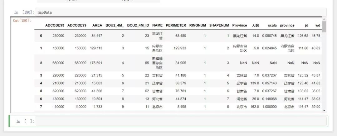 mapData = pd.DataFrame(basemap.china_info) mapData["NAME"] = mapData["NAME"].map(lambda x: x.decode("gbk") if len(x) != 0 else x)