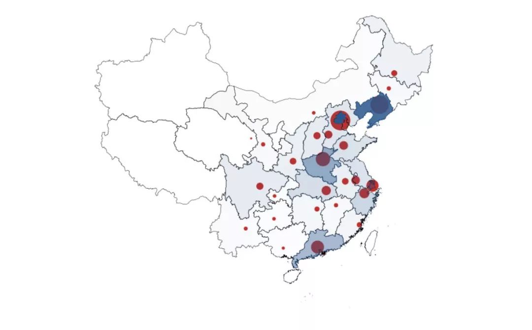 for info,shape in zip(mapData["NAME"].tolist(),basemap.china): if info == row['Province']: patches.append(Polygon(xy = np.array(shape), closed=True)) ax.add_collection(PatchCollection(patches,facecolor=mainColor,edgecolor=mainColor,linewidths=1.,zorder=2)) Domestic.apply(lambda row: plotProvince(row), axis=1)