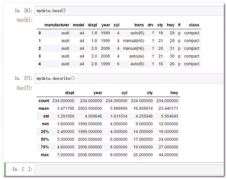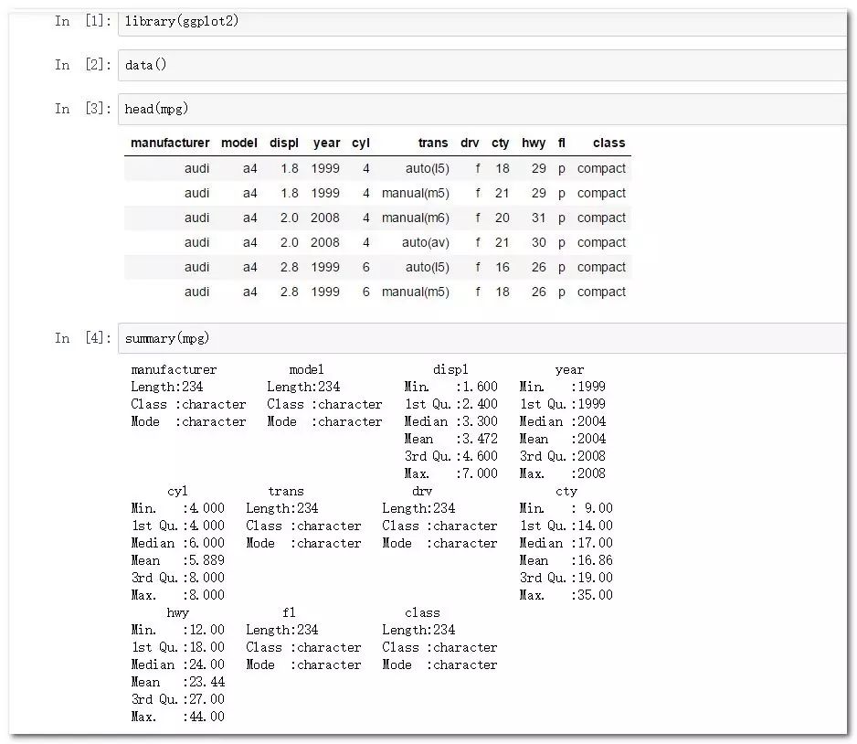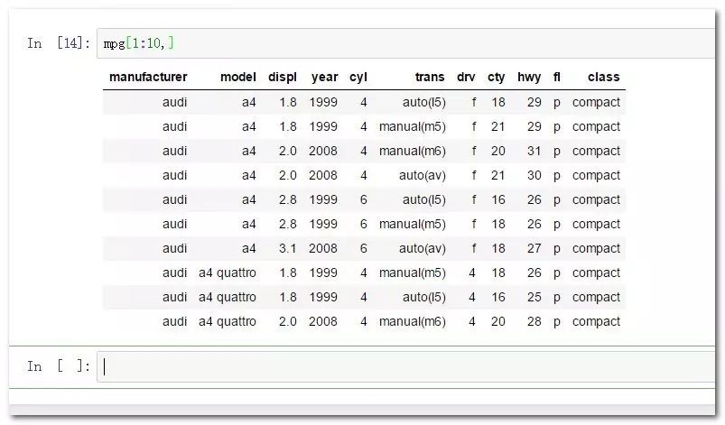 我使用ggplot2内置的mpg数据集来进行案例演示,数据框可以通过方括号传入行列下标的方式筛选各种符合条件的取值范围。