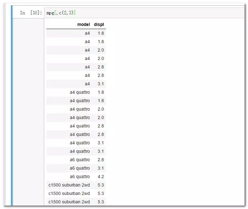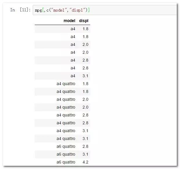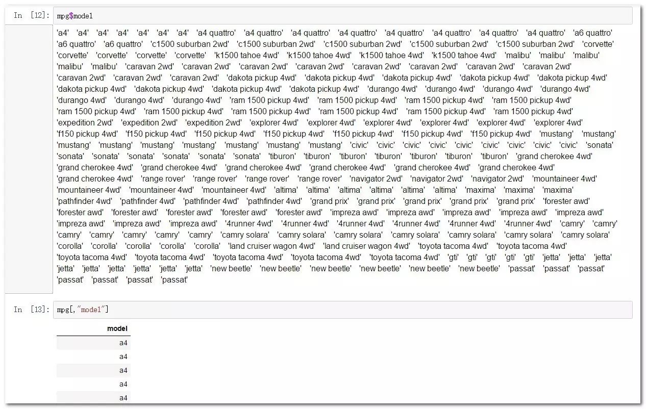 mpg$model 等价于 mpg[,"model"] #取单列时两种方法等价,但是第二种方法会自动降维(编程一个向量)。