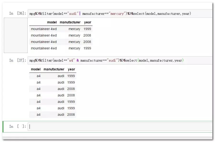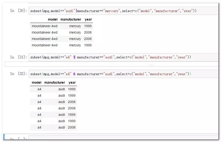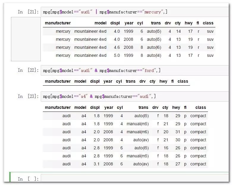 mpg[mpg$model=="audi" | mpg$manufacturer=="mercury",] #或条件