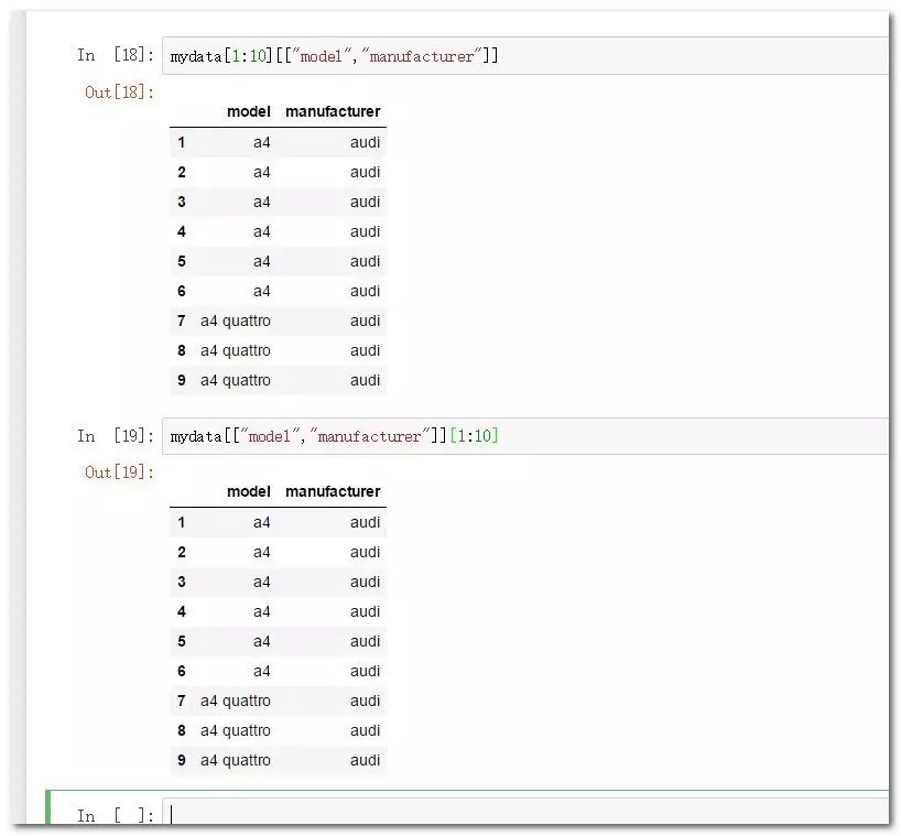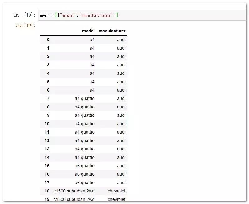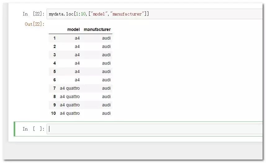mydata.loc[1:10,["model","manufacturer"]] #行列同时索引