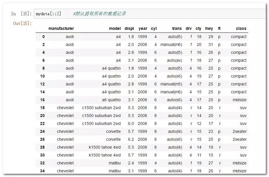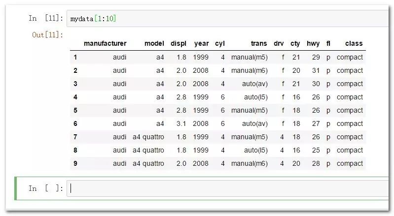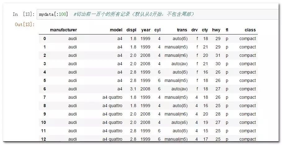 mydata[:100] #切出前一百个的所有记录(默认从0开始,不包含尾部)