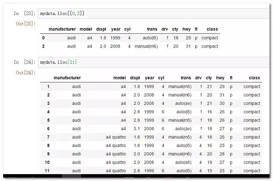 mydata.iloc[[0,2]] 等价于mydata.iloc[[0,2],:]