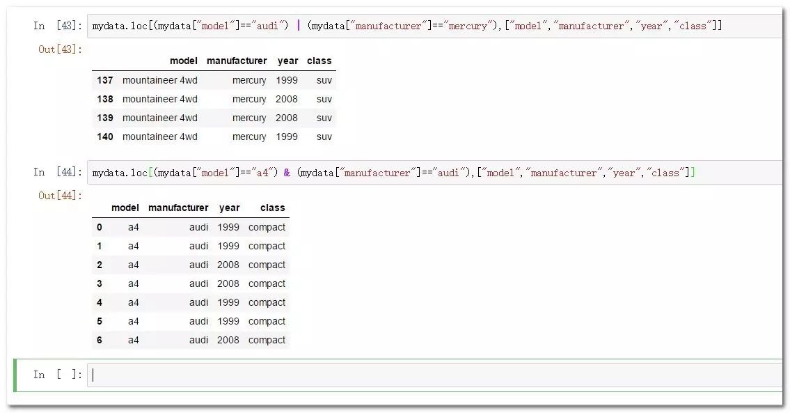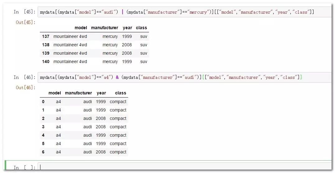 mydata.query('model=="audi" | manufacturer=="mercury"')