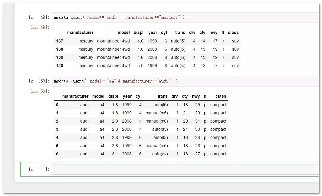 mydata.query(' model=="a4" & manufacturer=="audi" ')