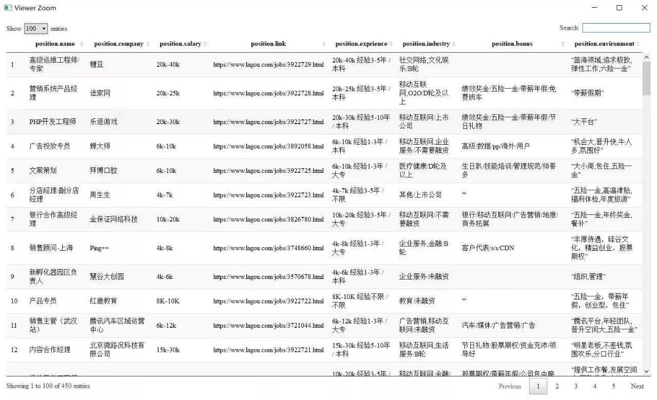 #使用字典内单个list的extend方法累计收集数据 myresult["position_name"].extend(result.xpath('//ul[@class="item_con_list"]/li/@data-positionname')) myresult["position_company"].extend(result.xpath('//ul[@class="item_con_list"]/li/@data-company')) myresult["position_salary"].extend(result.xpath('//ul[@class="item_con_list"]/li/@data-salary')) myresult["position_link"].extend(result.xpath('//div[@class="p_top"]/a/@href')) myresult["position_exprience"].extend([ text.xpath('string(.)').strip() for text in result.xpath('//div[@class="p_bot"]/div[@class="li_b_l"]')]) myresult["position_industry"].extend([ text.strip() for text in result.xpath('//div[@class="industry"]/text()')]) myresult["position_environment"].extend(result.xpath('//div[@class="li_b_r"]/text()'))