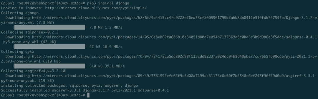 接下来的一系列步骤都要在我们创建虚拟环境 p5py 进行完成,安装 Python3 Django 模块。