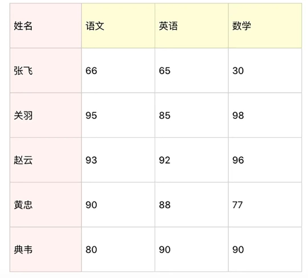 假设一个团队里有5名学员,成绩如下表所示。