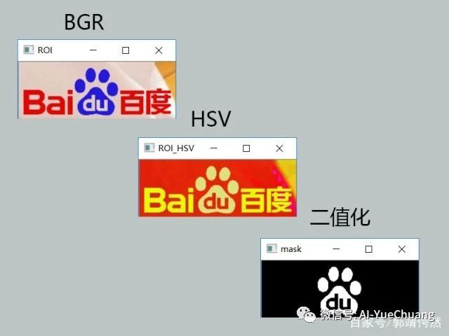 为水印创建蒙层:通过对水印logo的观察可以发现,该水印由红蓝两种颜色构成,因此我们需要对两种颜色分别处理。为了精确处理蓝色,我们可以先将ROI的颜色格式由BGR转换为HSV,然后调用inRange( )函数对ROI进行二值化处理,将蓝色区域变成白色,将其它区域变成黑色,这样就创建好了蓝色的蒙层(mask)。关于inRange函数和HSV请读者自行百度,本文不做详细介绍。