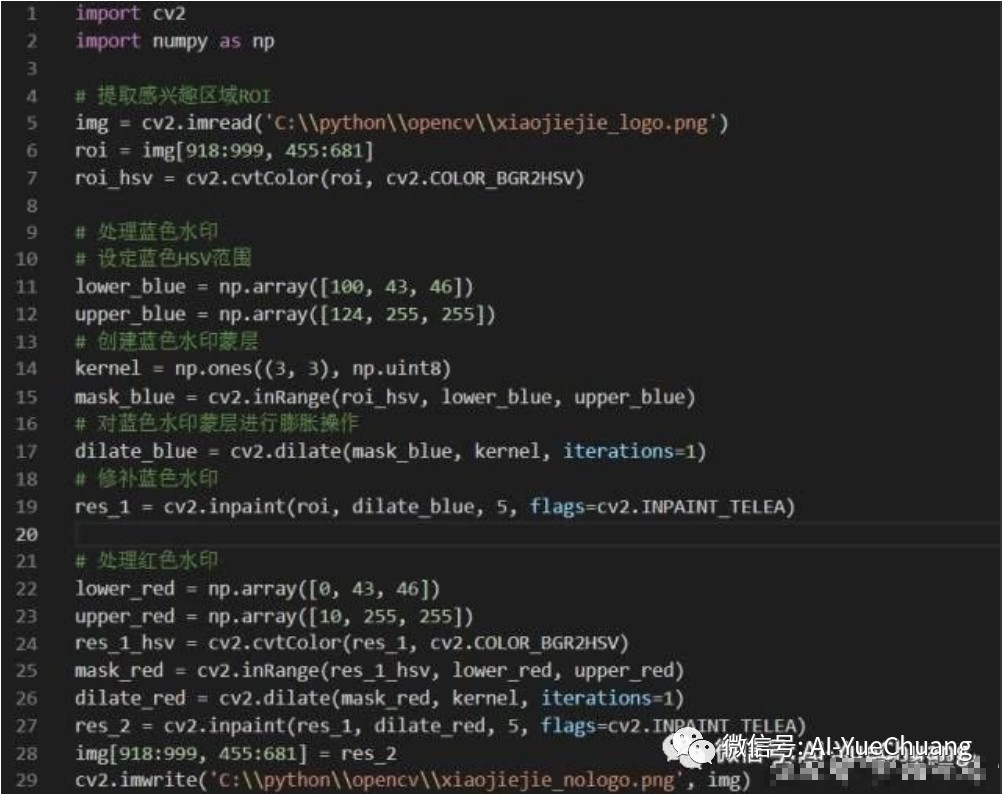 图片修补:将水印区域放大之后发现在水印的边缘有很多锯齿噪点,这些噪点与水印的颜色相差较大,很影响去除水印的效果。为了消除这些边缘噪点需要调用dilate( )函数对水印蒙层进行膨胀操作,膨胀是数学形态学的基本操作之一,会使蒙层适当扩大“淹没”边缘可能存在的噪点;接下来就是利用膨胀后的蒙层对ROI进行修补,用到的函数是inPaint( );最后一步把修补之后的水印区域回填到原图中,完整代码如下图: