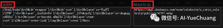 我们看到,这里选中的是一个元素,我们要匹配上所有的电影海报,就需要缩减 XPath 表达式。你可以在 Query 中进行 XPath 表达式的缩减,尝试去掉 XPath 表达式中的一些内容,在 Results 中会自动出现匹配的结果。