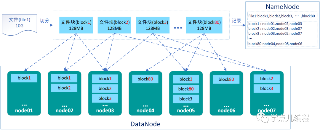第一步:在存储前会先对待存储文件进行块切分,上面示例中每块大小是 128MB(每块大小可配置),总共需要切分80块。