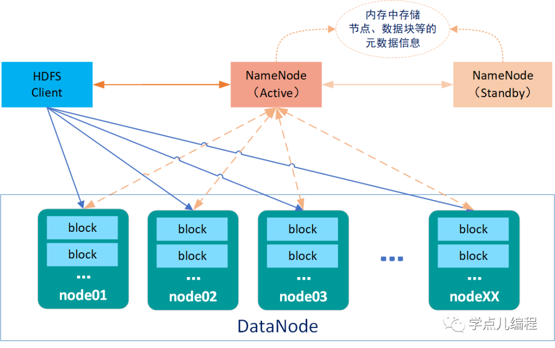 | Client | • 对待存储文件进行切分 • 与NameNode交互交换文件元数据信息 • 与DataNode交互,读取或写入数据 • 管理HDFS(基于nameNode对dataNode上的数据进行管理) |
