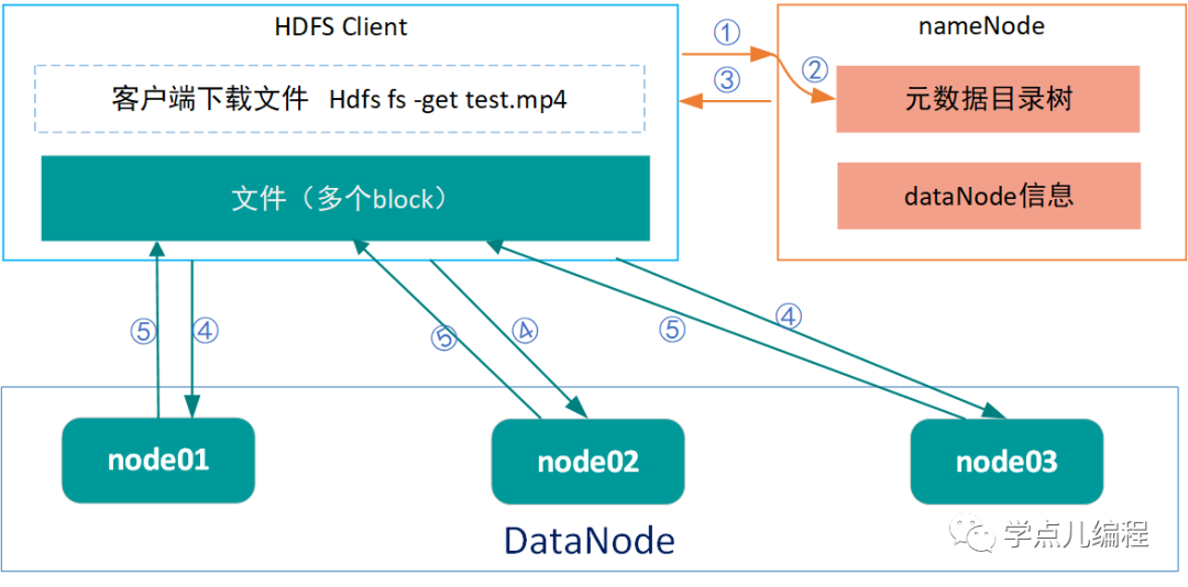 ⑤dataNode响应客户端请求,将数据返回给客户端。