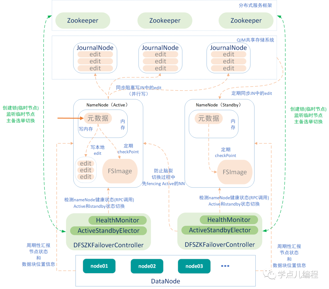 HDFS集群中一般都存储着大量的数据,HDFS有一套稳固的高可用方案来确保不出现数据丢失或集群崩溃。我们一起分析一下HDFS的高可用原理: