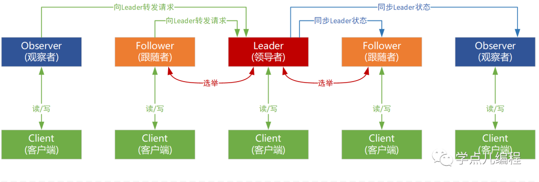 观察者 Observer | 接收客户端读请求,将客户端写请求转发给Leader; 不参与投票过程,只同步Leader的状态; 目的是为了扩展系统,提高读取速度。 | |