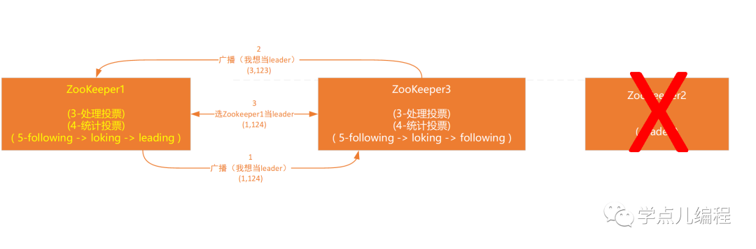 如上图:原集群有三台服务器,当前Leader(Zookeeper2)某种原因宕机了,此时便开始Leader选举: