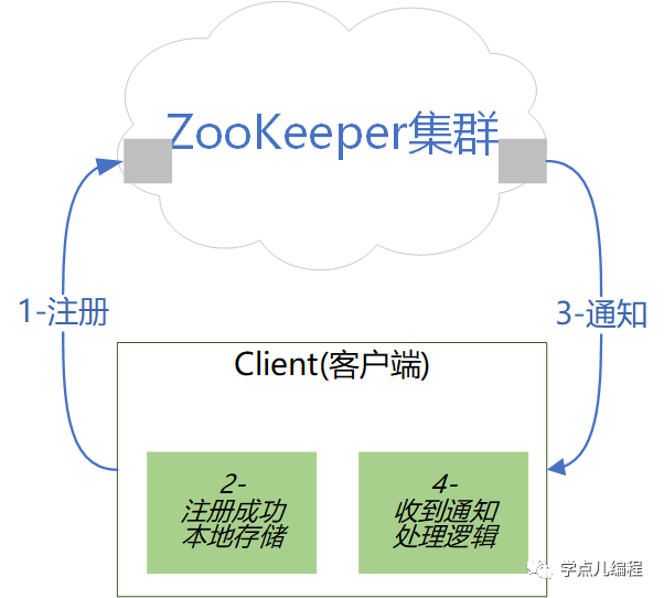 ![]() | 第1步:客户端注册Watcher到服务端; 第2步:注册成功,本地存储当前状态; 第3步:集群中所监控节点发生变化,服务端通知客户端数据变更; 第4步:客户端回调Watcher处理变更应对逻辑。 |
